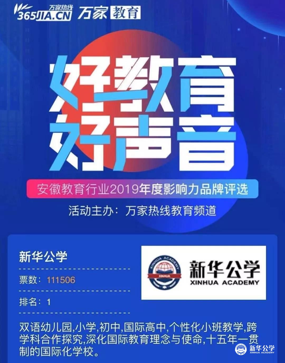 2019年度安徽教育行业影响力品牌评选榜单揭晓新华公学荣获“2019年度影响力品牌国际化教育学校”荣誉称号