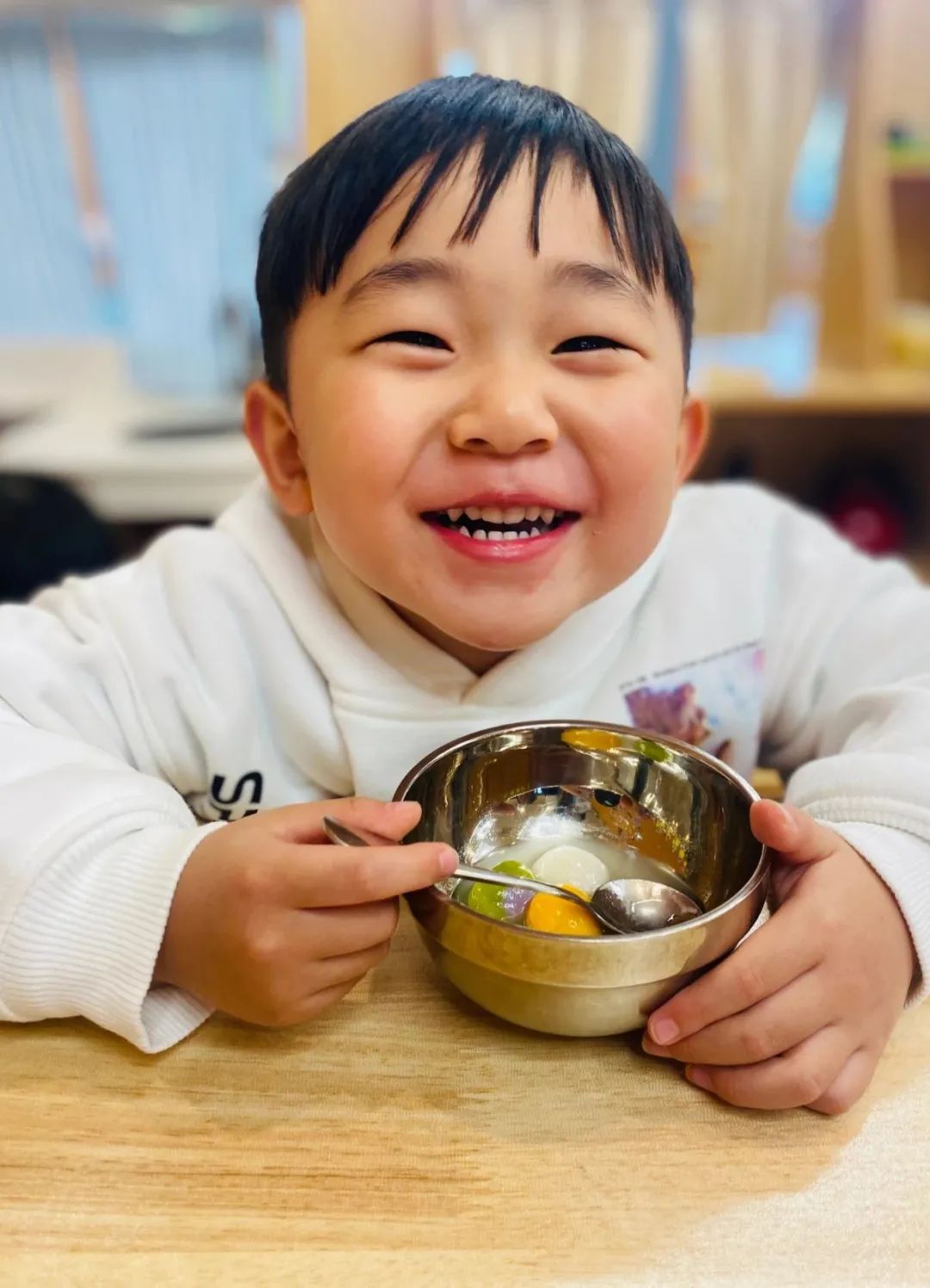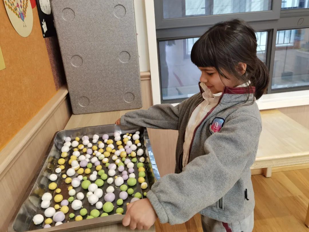 食堂的叔叔阿姨早已准备妥当,左手元宵,右手灯谜,为大家带来了节日大餐。幼儿园的小朋友们还亲自动手制作了团团圆圆的多彩元宵。
