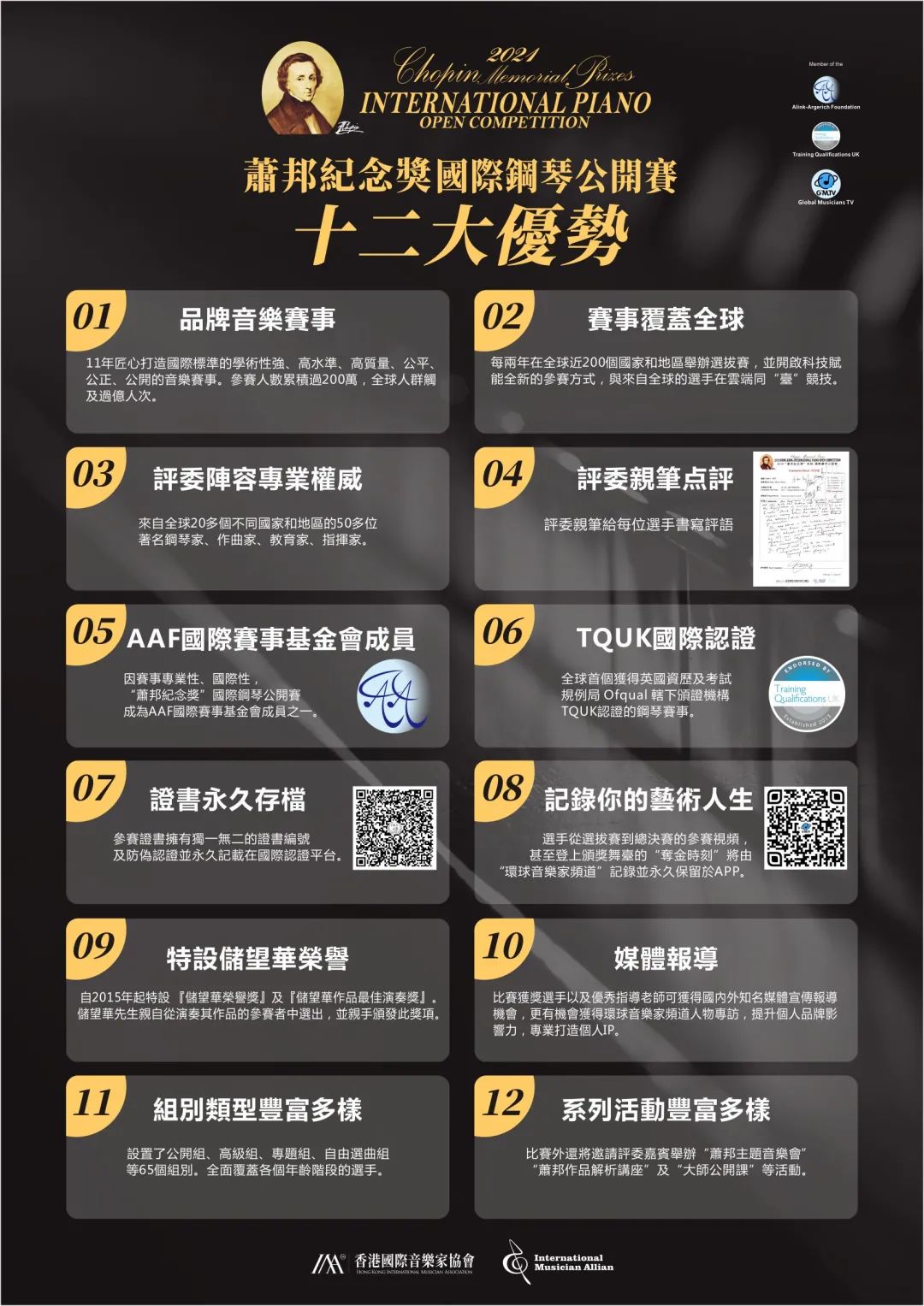 2021“萧邦纪念奖”国际钢琴公开赛由香港国际音乐家协会(IMA.HK)主办;由International Musician Allian以及环球音乐家频道(GMTV)协办提供技术支持。