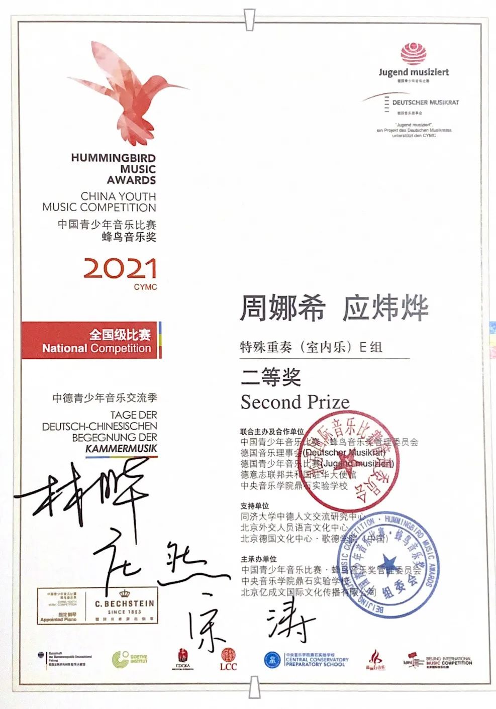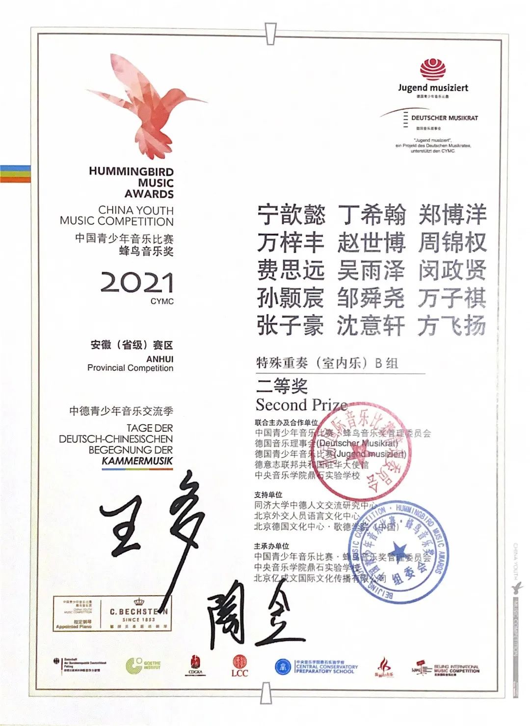 在2021年中德青少年音乐交流季·蜂鸟音乐奖中,XHIO乐团派出了多组优秀的室内乐选手参赛,在6月16日在安徽省级赛和7月17日的北京全国总决赛中,与众多国际学校、音乐学院等强大选手同台竞技。最终参赛选手们以稳定的发挥与精湛的技艺斩获了优异成绩!