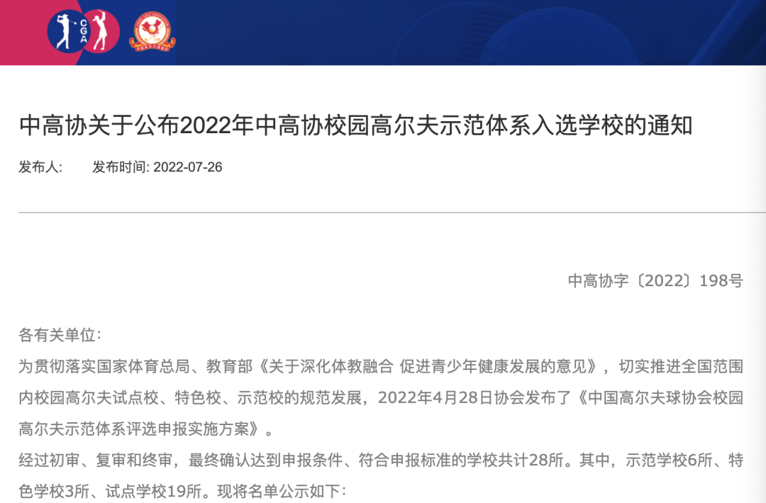 据中国高尔夫球协会2022年7月26日在官网公布的中高协字〔2022〕198号文件所示:合肥新华公学成为2022年全国“校园高尔夫”试点学校,同时也是安徽唯一一所试点学校。