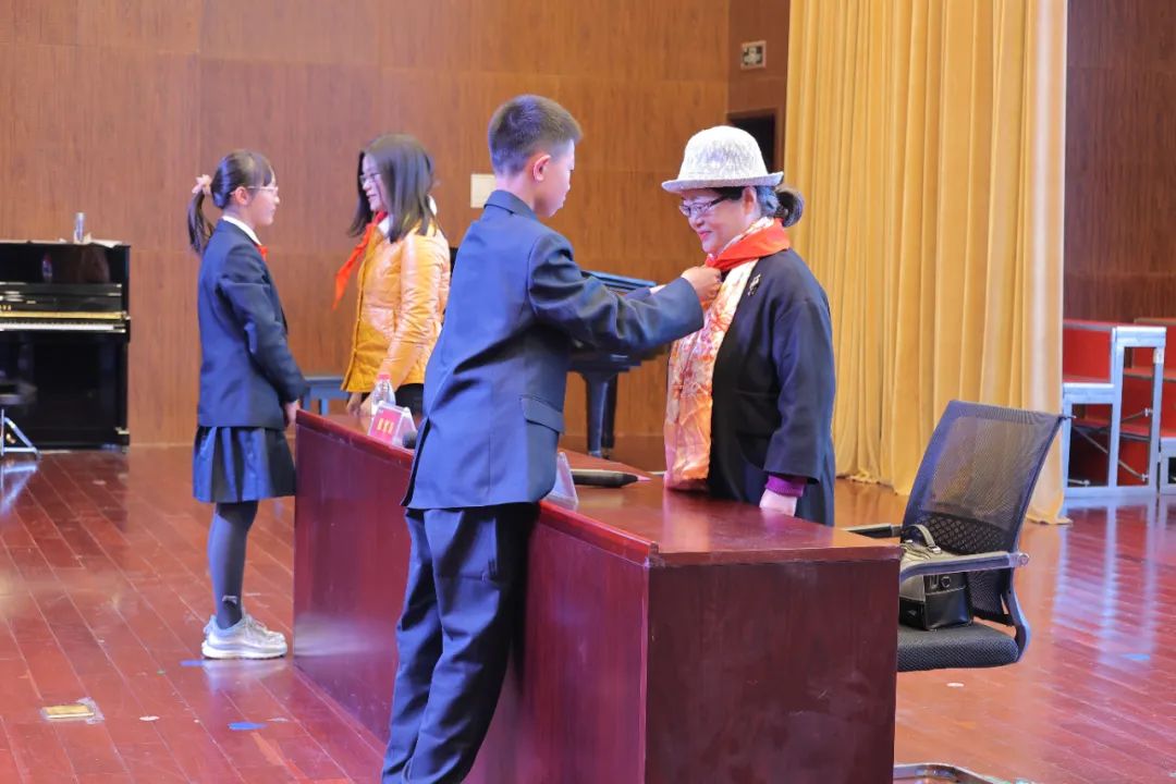 活动在在主持人吴晶晶校长的介绍下,正式拉开帷幕。秦老师和戴老师亲切地和同学们打招呼,引得台下掌声雷动。少先队员代表们上台为秦老师和戴老师佩戴上鲜红的红领巾,表达了对两位老师的尊敬和爱戴。
