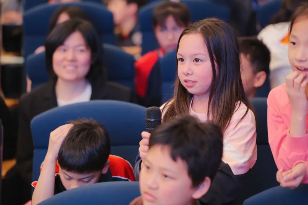 随后,秦文君老师就围绕着“书香校园”做了生动有趣、引人入胜的主题讲座,台下同学们也不时附以热烈的掌声。秦老师时而幽默反问,时而引发深思,讲述着有关“阅读”和“写作”的切身经历,带领孩子们进行了一次奇妙的“文学之旅”。