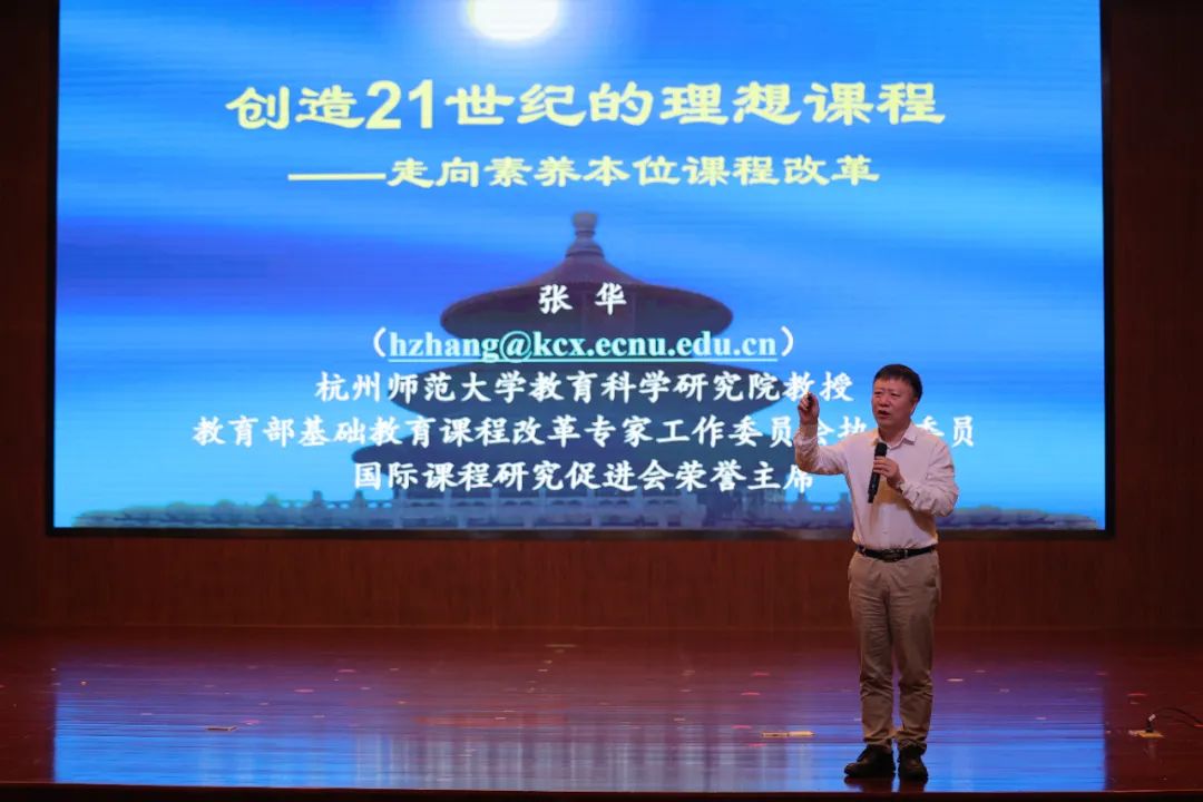 张华教授以“让学生创造着长大——素养本位课程改革的五大理念”为主题开始新课标的解读。