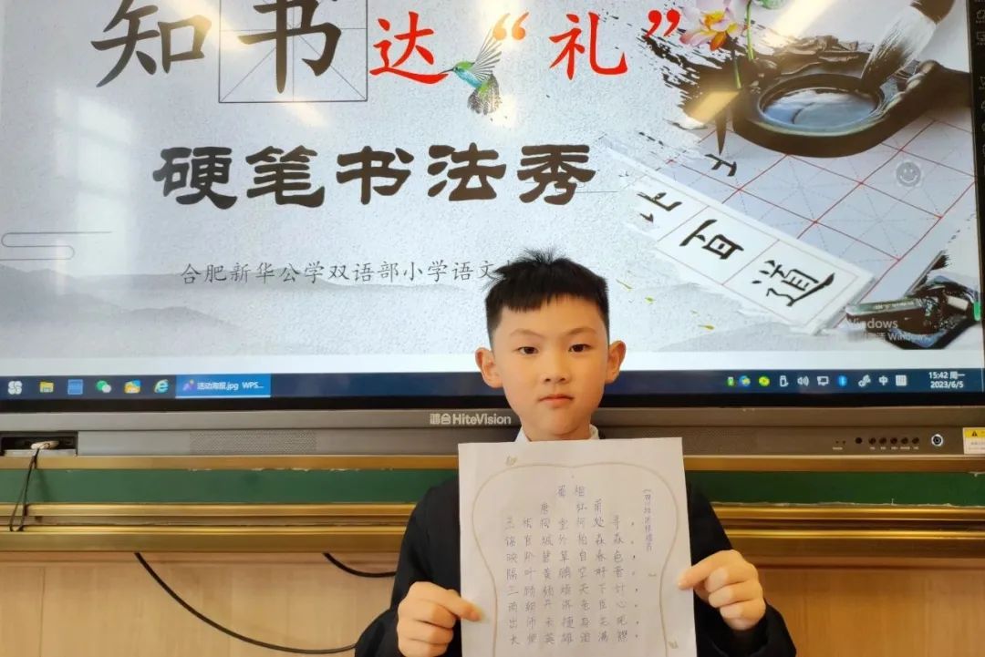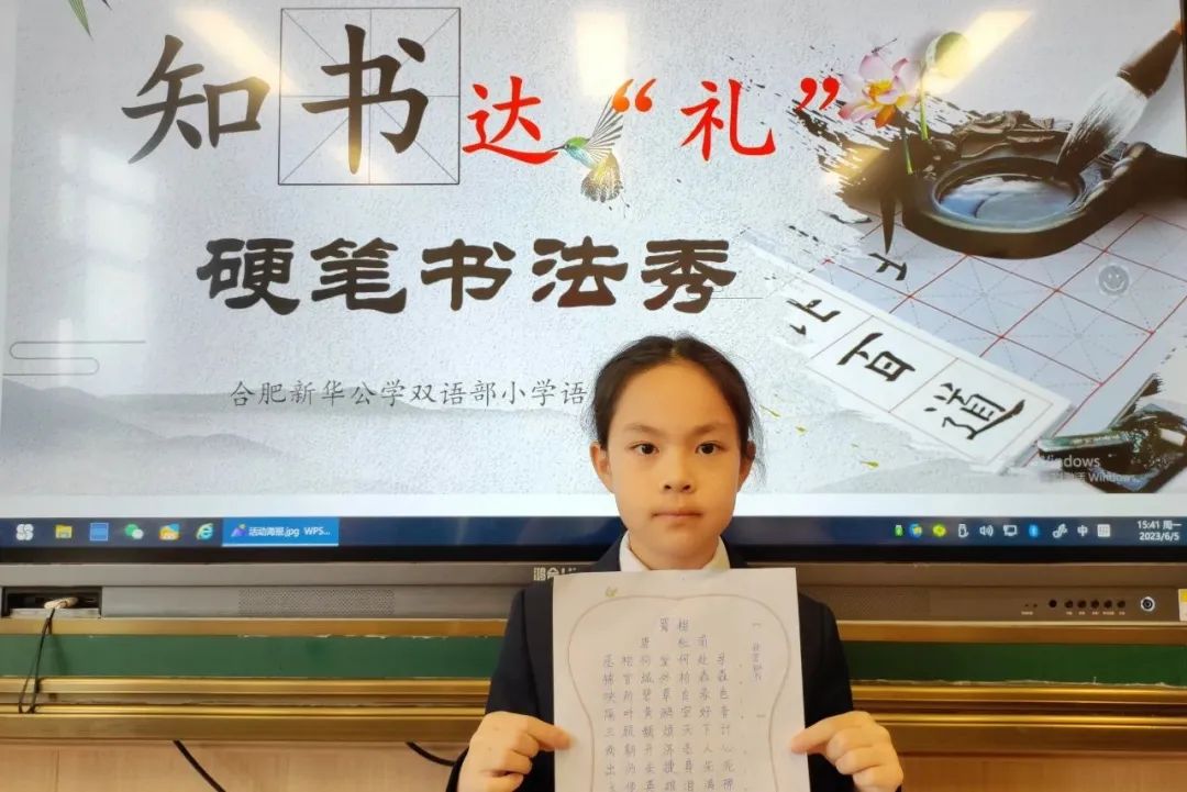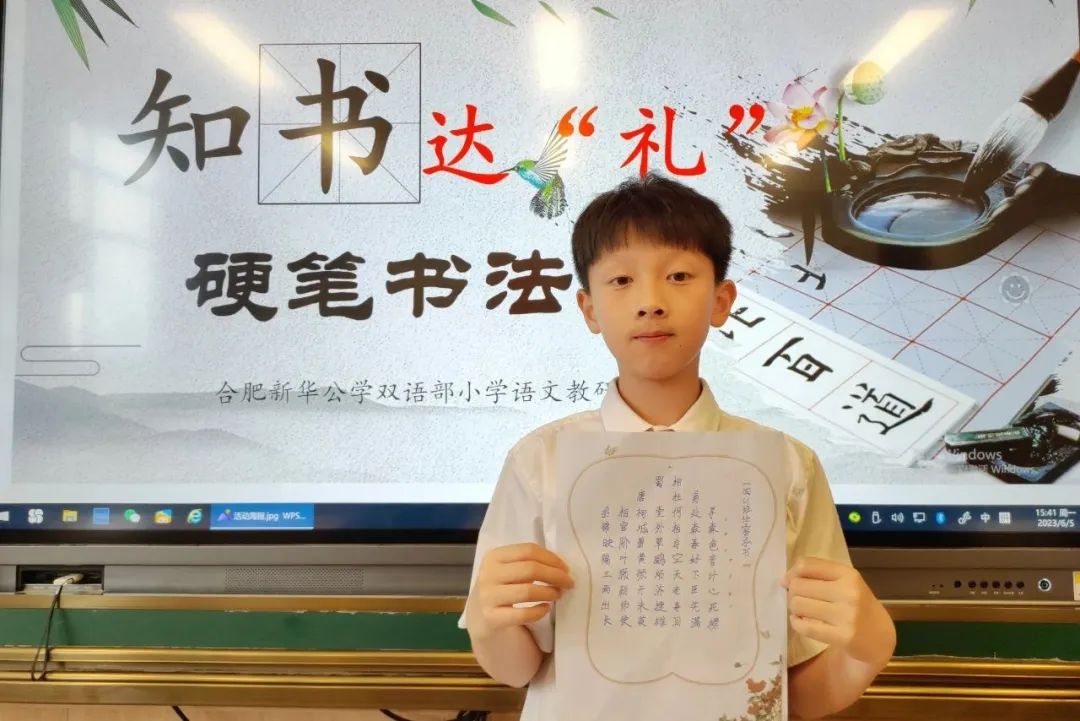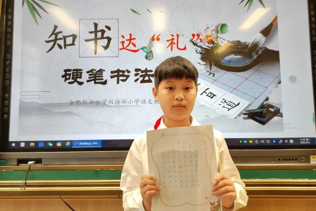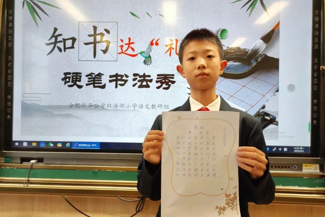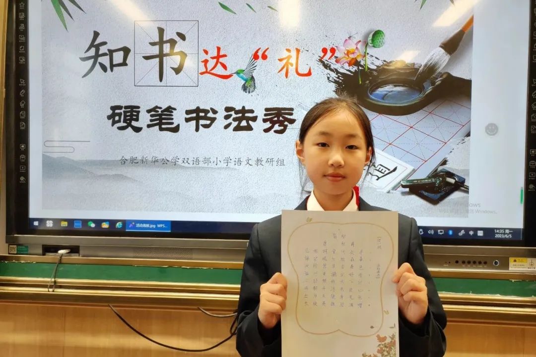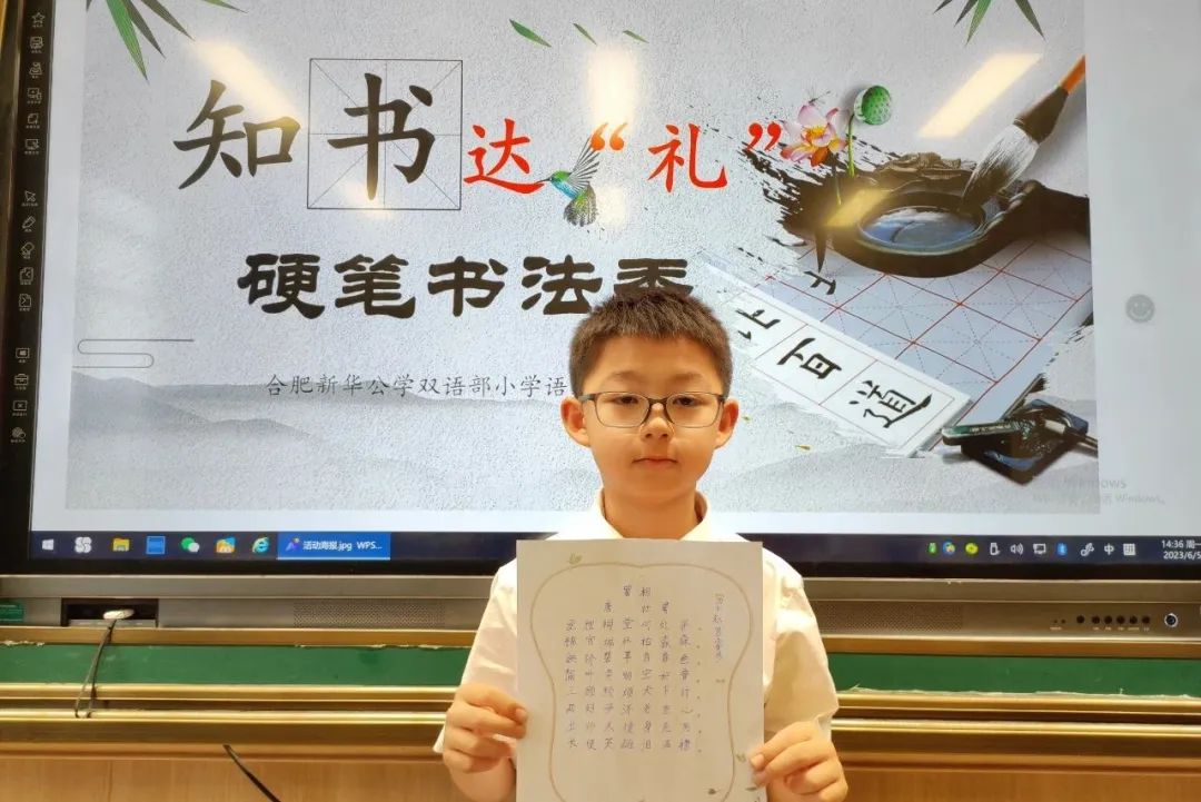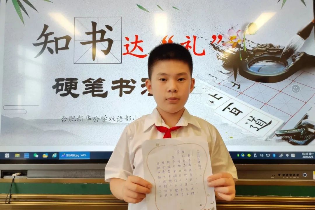 熊秉明先生说:“中国书法是中国文化核心的核心”。饱经沧桑的中华民族,蹚过浩荡五千年历史长河而屹立不倒,从孔孟之道到新文化运动,志士仁人以笔为戈、薪尽火传,关键在于汉字传承。当代汉字与甲骨文一脉相承——在世界文明发展史上,这是绝无仅有的奇迹。文化传承,书香赓续,是要有载体有传人的,这一切的落脚点关键在于孩子。为传承和发扬汉字书法的历史文化,规范汉字书写,新华公学双语部小学开展了“知书达‘礼’”硬笔书法展示秀活动。