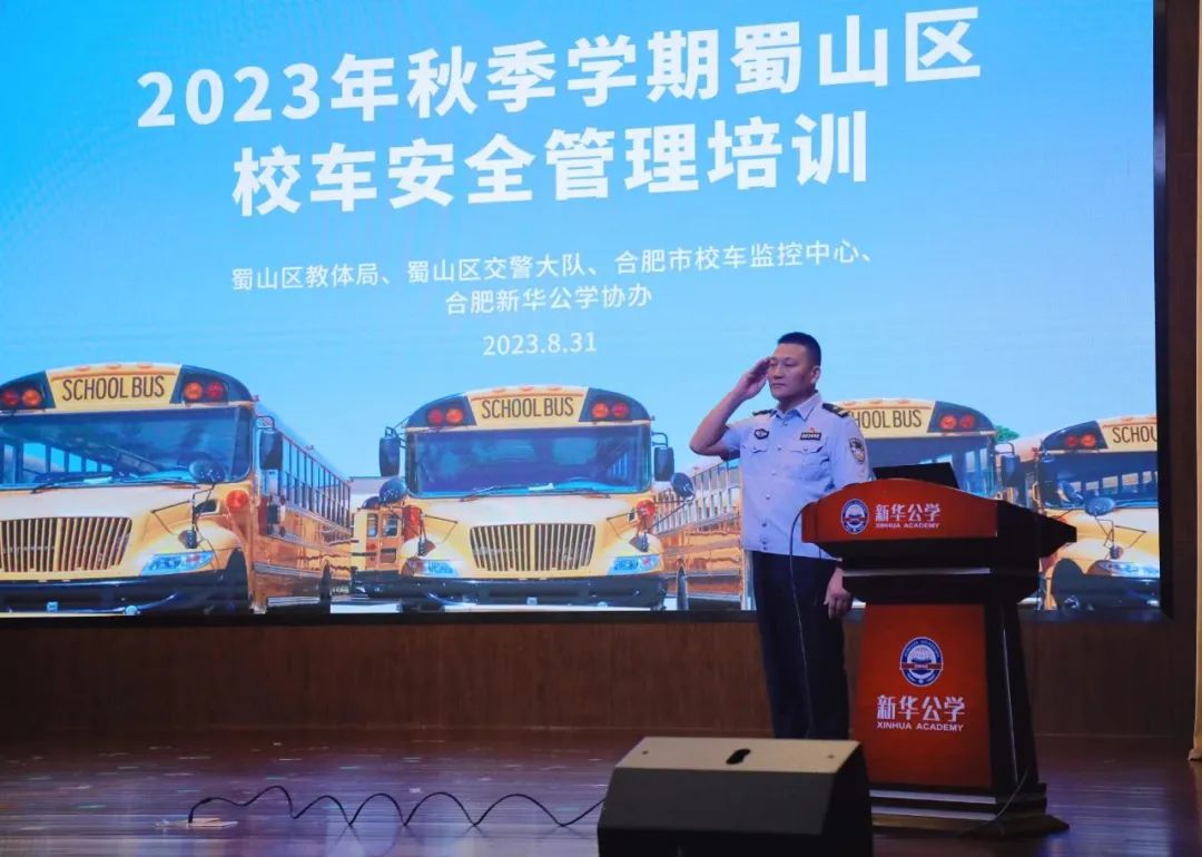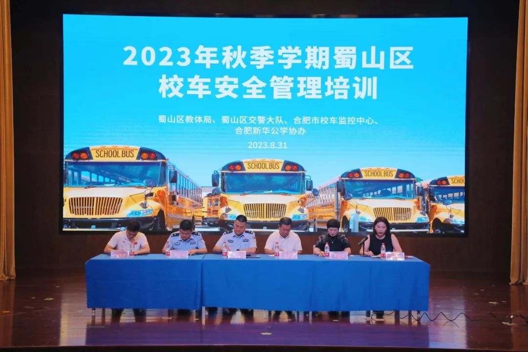 为保障校车安全运行,8月31日上午,蜀山区教育体育局联合合肥市校车监控平台、蜀山区交警大队,在合肥新华公学召开2023年秋季学期蜀山区校车安全管理培训暨校车安全检查活动。蜀山区教体局校安科李传华校长、蜀山区教体局校安科吴致君主任、蜀山交警大队唐二飞副大队长、蜀山交警大队徐国毅警长、合肥市校车监管平台王成葆主任以及蜀山区校车使用单位负责人、驾驶员、安全员及随车照管员近百人参加了活动。