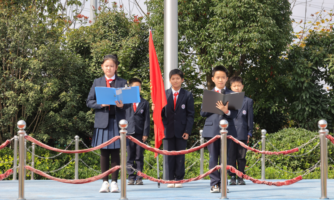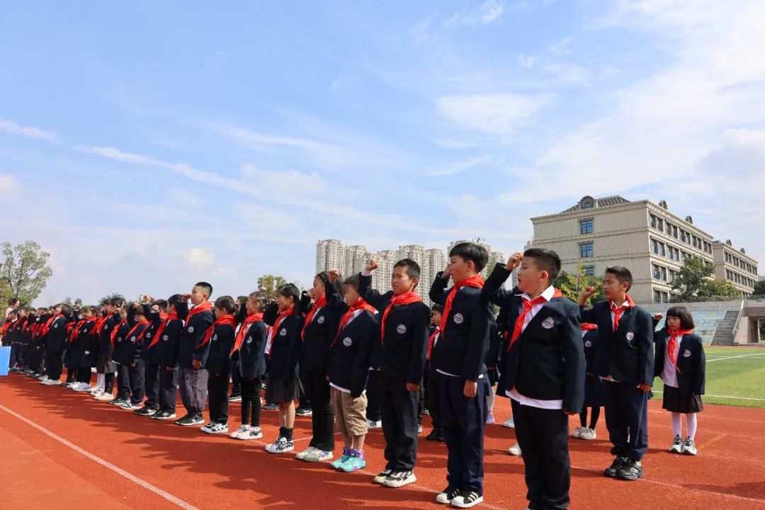 主持人白紫妤和王万豪宣布仪式正式开始。大队旗手身姿挺拔,步伐整齐地步入会场中央。所有学生齐唱中国少年先锋队队歌,嘹亮的歌声响彻在操场上空。