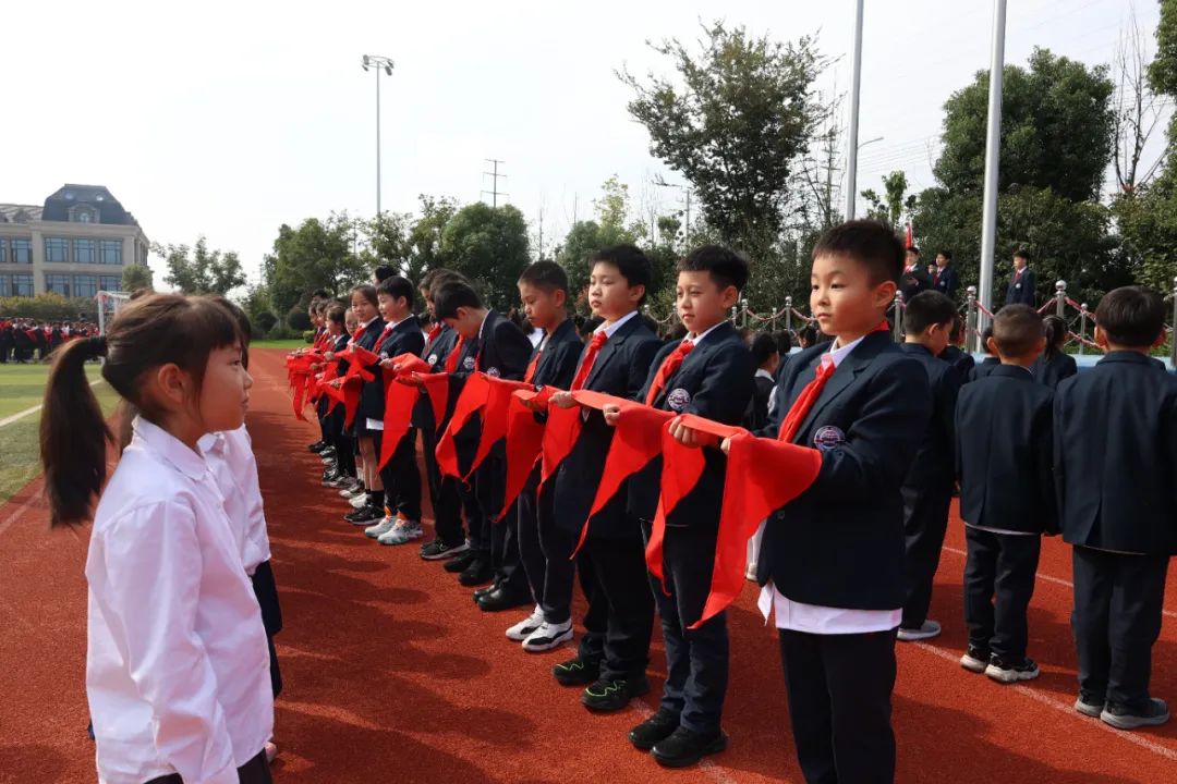 五年级少先队员代表为新队员系上鲜艳的红领巾,共同见证这一光荣的时刻。小队员们系上红领巾骄傲地和大哥哥大姐姐们互敬队礼。