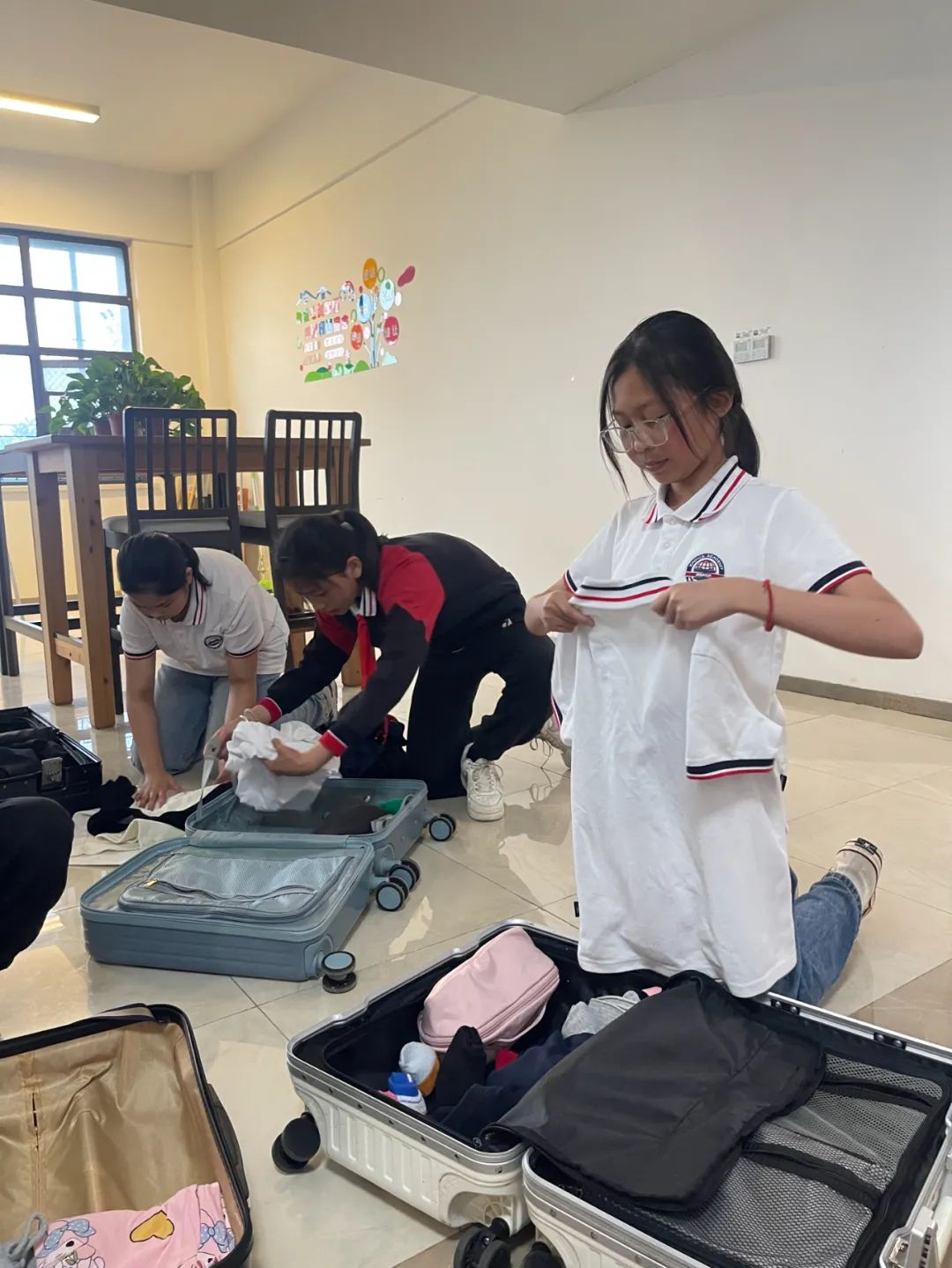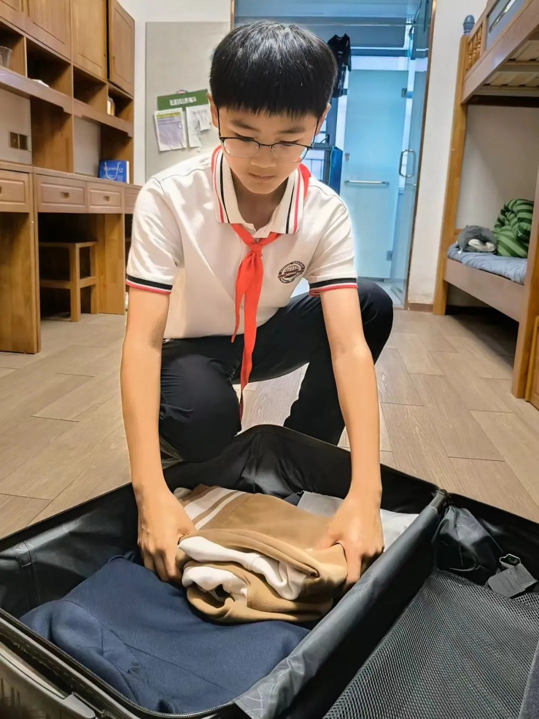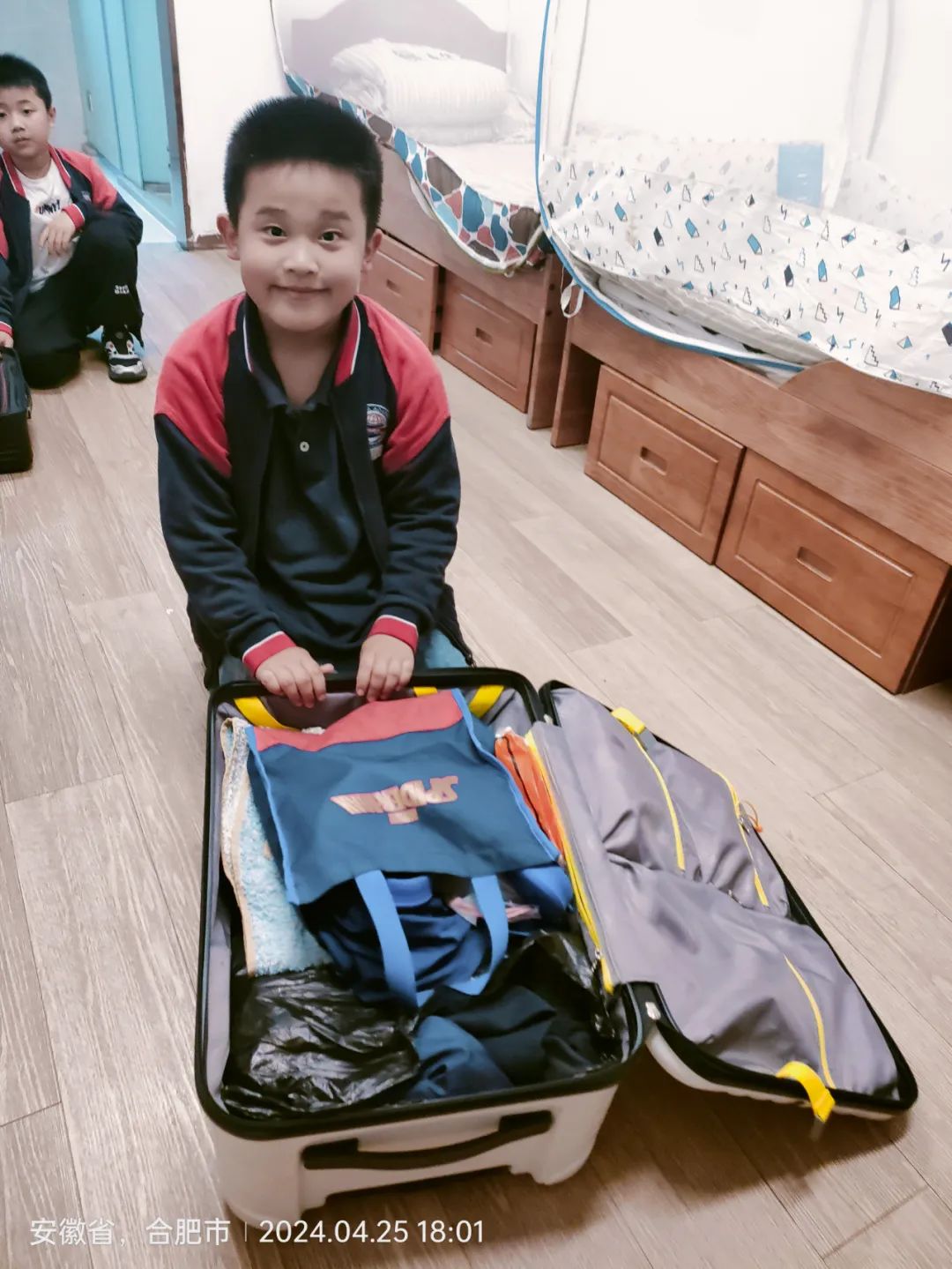 收纳、整理行李箱:进行分类摆放,合理安排空间,依次平整放置,整洁美观,整理完成、合上箱子、锁好放置,一气呵成,小能手们严肃认真、细致入微、精益求精、追求完美的态度,饱含着他们对集体荣誉的爱护与珍惜,孩子们激动地等待评委老师的检查,每位同学都绽放出自信的笑容。