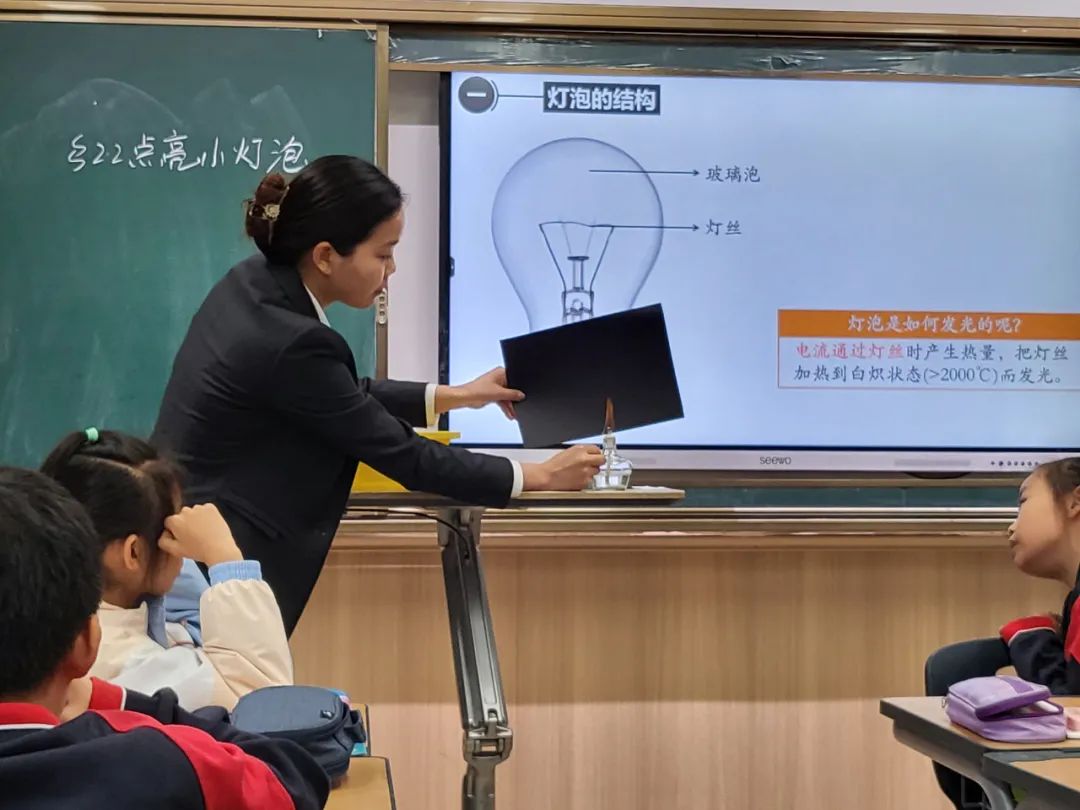 所以本节课程教学内容围绕两个部分开展:第一部分是通过观察了解小灯泡的结构及作用,第二部分是通过小组合作探究让小灯泡发光的连接方式。通过观察小灯泡构造、尝试点亮小灯泡让学生充分享受成功的喜悦,很好的激发了学生进一步探究有关“电”的奥秘的兴趣,并思考电是怎样流动的,做出最简单的对电流的解释,进而区分短路和断路,对电路形成一个初步的认识。本节课也有需要进一步改进的方面,比如黑板展示的图形卡片可以更大一点,有的小组是5位学生,导致学生在实验分工时显得有些困难,后期还是要4人一组。板书还需要紧扣教学进度,内容布局等要更合理些。