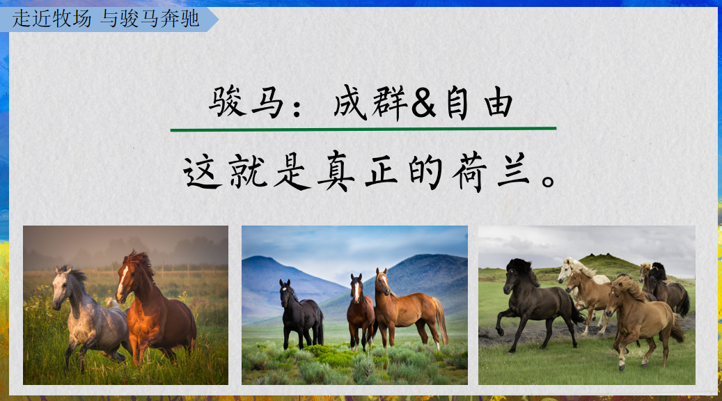 引导学生多读,从读中慢慢感受动物们在牧场上自由生活的场景,只要学生能从字里行间感受到牧场的和谐宁静,体会到牛、马、羊等动物的悠然自得,那么课文所要传递的感情就已经渗透进学生的脑海之中了。在读的过程中引导学生结合语句想象画面,升华感受。在经过各种方式的朗读之后,全班讨论交流:作者眼中“真正的荷兰”是怎样的?为什么反复强调“这就是真正的荷兰”?最后将自己的感受融入到朗读中,反复“读—悟—读”,最后达到体会作者特别的表达方法的目标。