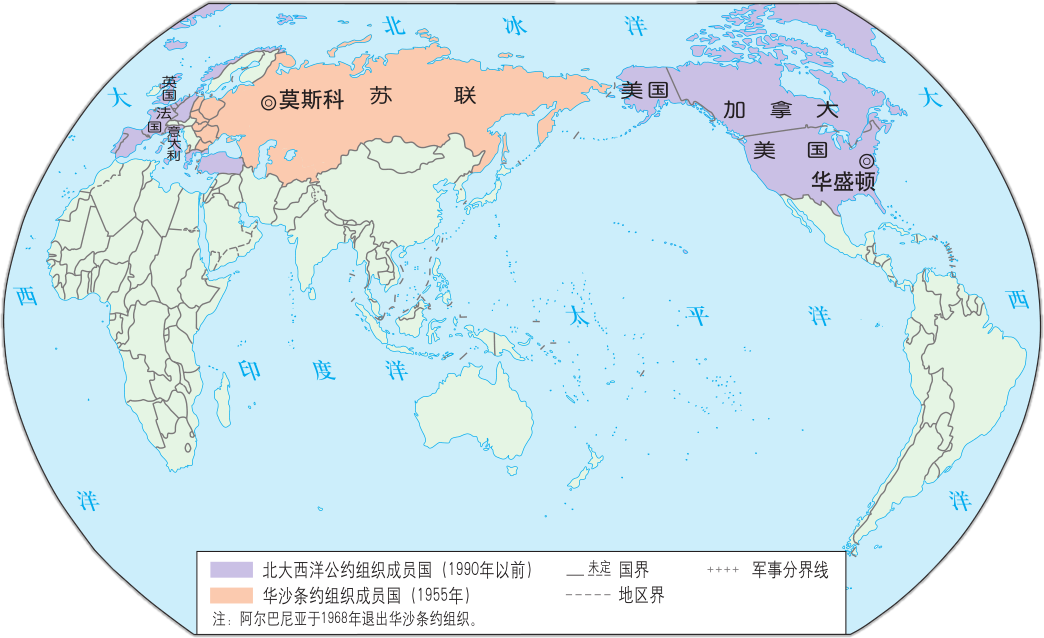 【教师】强调时间是从1947-1991年,冷战双方是以美苏为首的两大阵营,冷战是美苏在二战后对抗的主要方式。