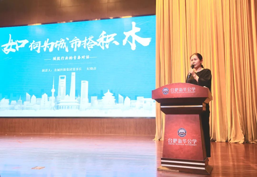 合肥北城建投控股集团董事长纪晓彦女士以《如何为城市搭建积木》为主题,将城市建设比作“积木游戏”,生动讲解金融资本与城市规划的联动逻辑。她寄语同学们:“用专业与责任,筑造属于自己与社会的未来。”