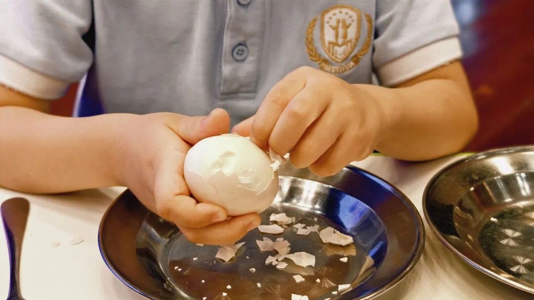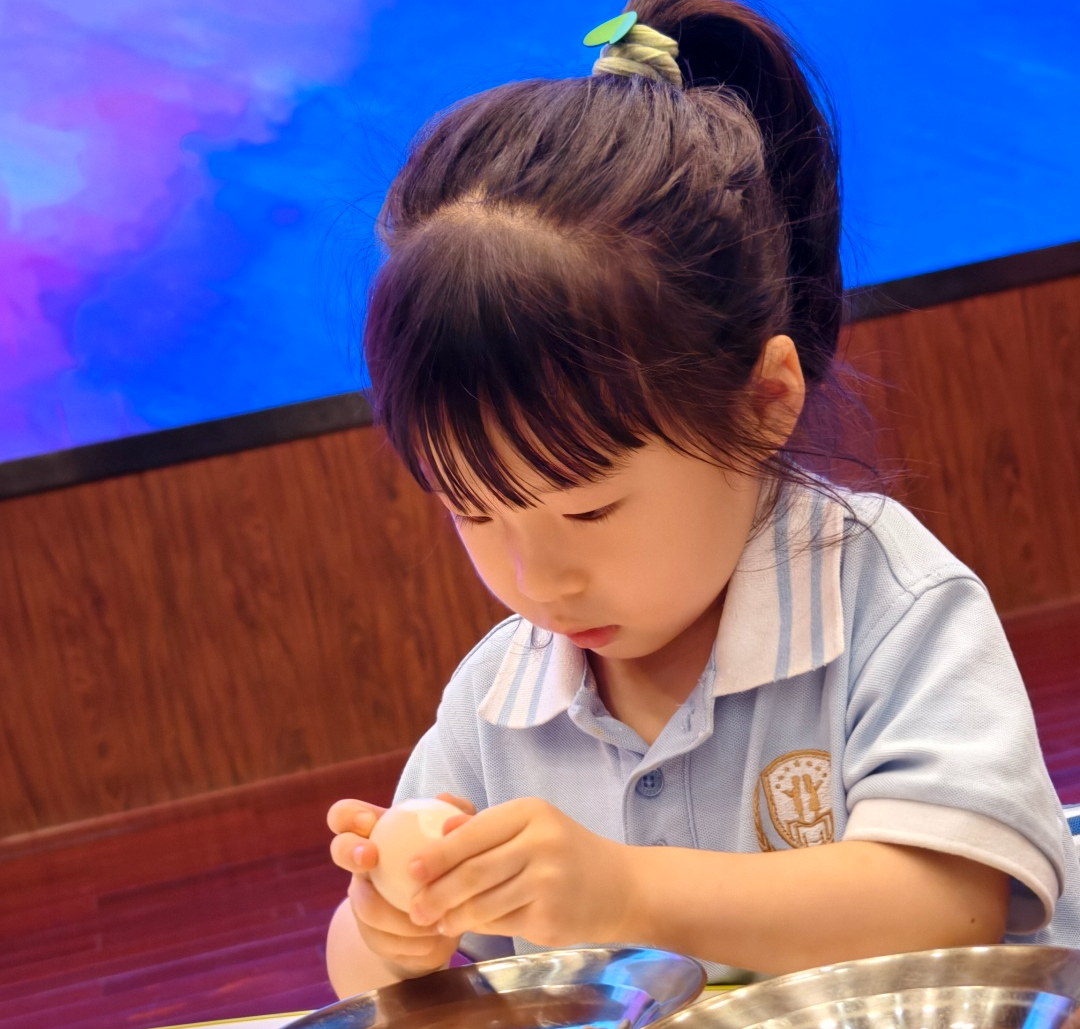 小手专注敲击、耐心剥离,白嫩嫩的鸡蛋完整亮相。这份对细节的关注,是勤于思考的体现。
