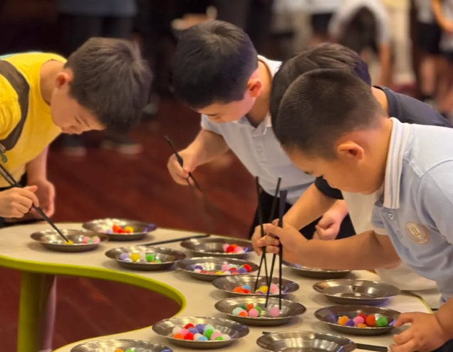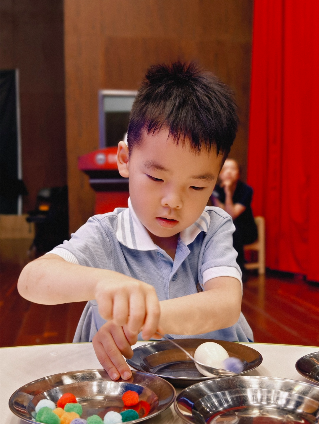 小小筷子在指间灵活开合,毛球被稳稳夹起。这份指尖的精细控制力,是书写与探索世界的基石,展现了勇于尝试和知识渊博。动作麻利,一气呵成!大班哥哥姐姐们展现了令人惊叹的独立性和责任感,是IB学习者“全面发展”的雏形。