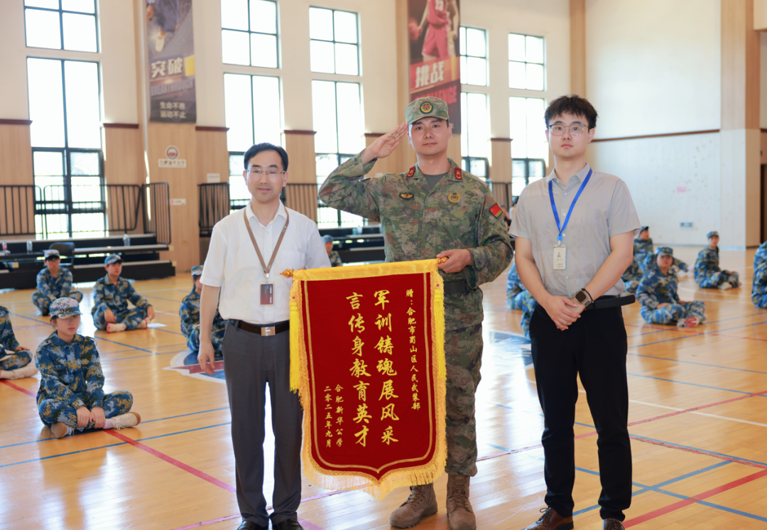 成果展示结束后,学校对在此次训练中表现突出的集体和个人进行了表彰,激励全体同学见贤思齐。随后,合肥新华公学总校长江涛向教官们献上锦旗,表达了全体师生对教官们严格施训、辛勤付出的崇高敬意与感谢。教官代表在发言中高度赞扬了同学们的训练热情和巨大进步,希望同学们将所学所得转化为持久行动。