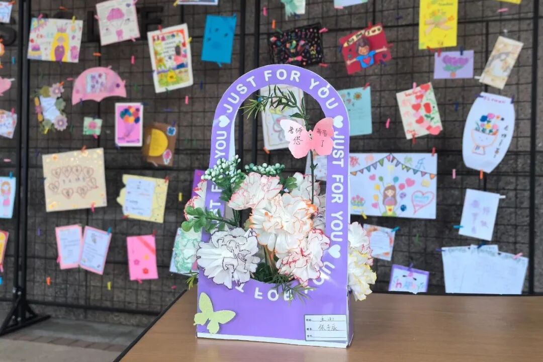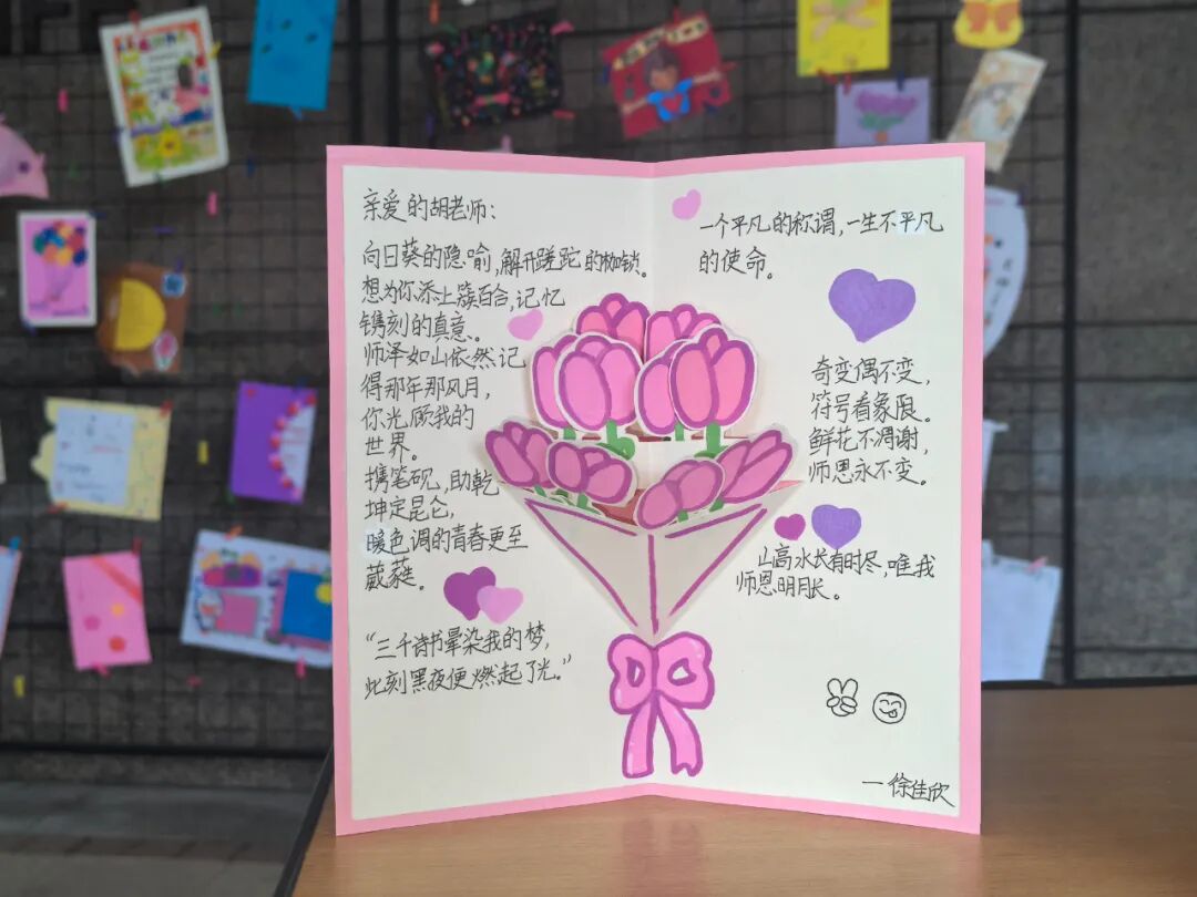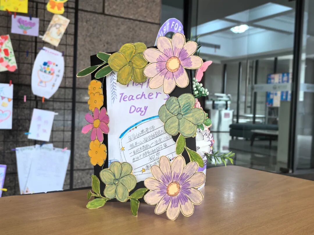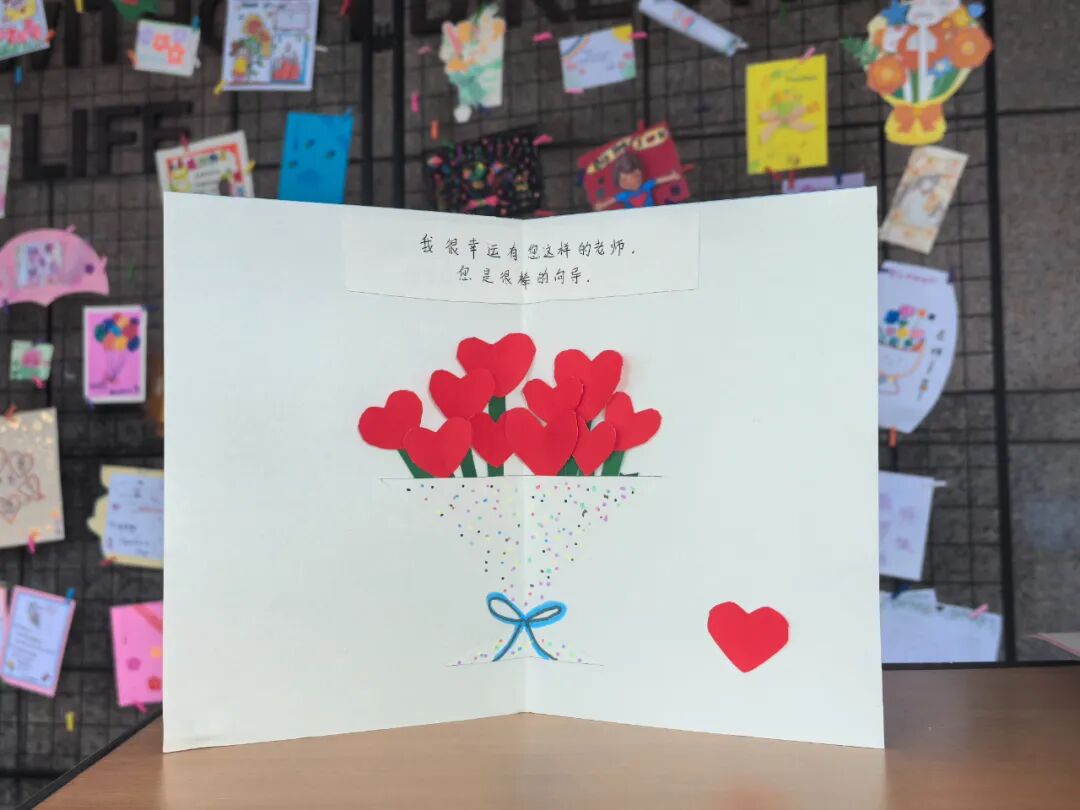 漫步展厅,处处可见动人的细节:有的孩子用日历标记这个特殊的日子,让祝福更具纪念意义;有的将各科老师的特色融入作品设计,展现着细致的观察力;还有的以花朵、爱心等意象,喻示师恩如春雨般润物无声。这些作品不仅展现了学生们的创意与才情,更体现了我校"感恩润心"教育理念的生动实践。