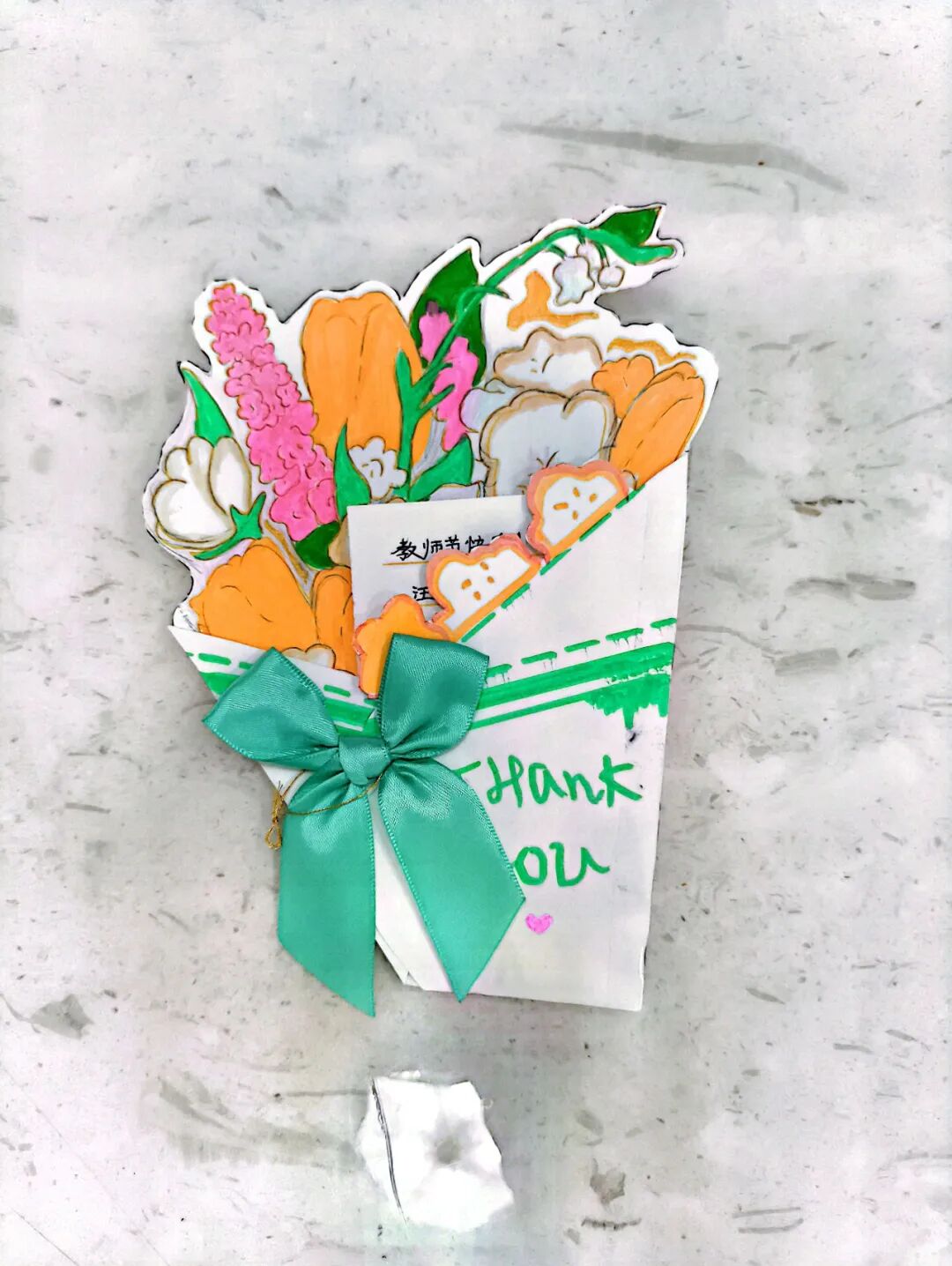 高年级同学则以巧手匠心,制作出一张张独具特色的手工贺卡。"感谢师恩,亲爱的老师:感谢您的辛勤付出,祝您节日快乐!"这样真挚的祝福,配以精心设计制作的手工元素,让每张贺卡都成为独一无二的心意载体。五(2)班束依晓同学的作品,更是将中英文祝福巧妙融合,展现着新华学子的特色。