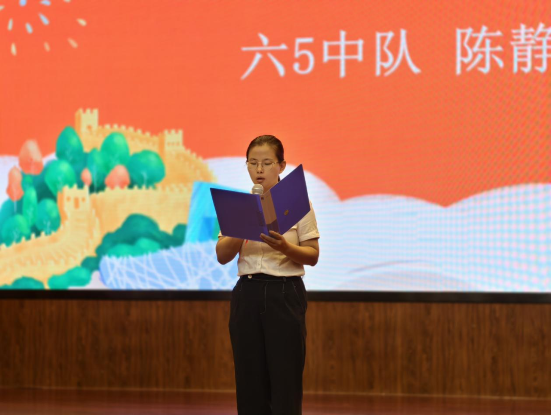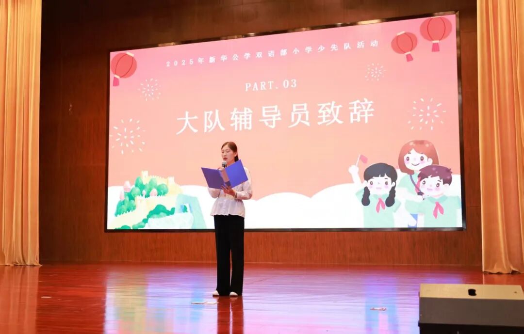 大队辅导员王天一老师为仪式致辞。她首先向新成立的中队和新任的中队长们表示热烈的祝贺,并回顾了学校少先队组织的光荣历程。她勉励全体队员要牢记嘱托,从小树立远大理想,勤奋学习,锻炼体魄,培养优良品德,努力成长为能够担当民族复兴大任的时代新人。辅导员的话语中充满了对队员们深深的关爱与殷切的期望。