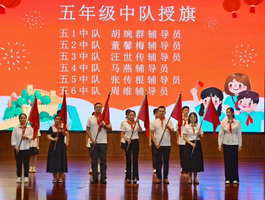 紧接着,仪式进入了核心环节——授中队旗。各新建中队的旗手精神抖擞,昂首阔步走上主席台,郑重地从大队委员手中接过象征着责任与荣誉的中队旗。一面面队旗的授予,标志着一个个新的集体正式融入了少先队这个温暖的大家庭,新的征程就此启航。