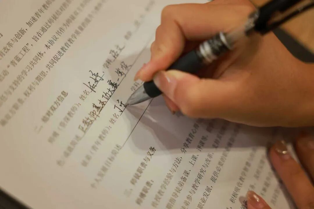 师徒依次上台,在庄严的氛围中签订《师徒结对协议》。笔尖落下的瞬间,是承诺的开始:师傅将倾囊相授教学方法、教育理念;徒弟将认真吸收经验,主动成长。这份协议,是师徒共同成长的“契约”,更是教育初心的“见证”。