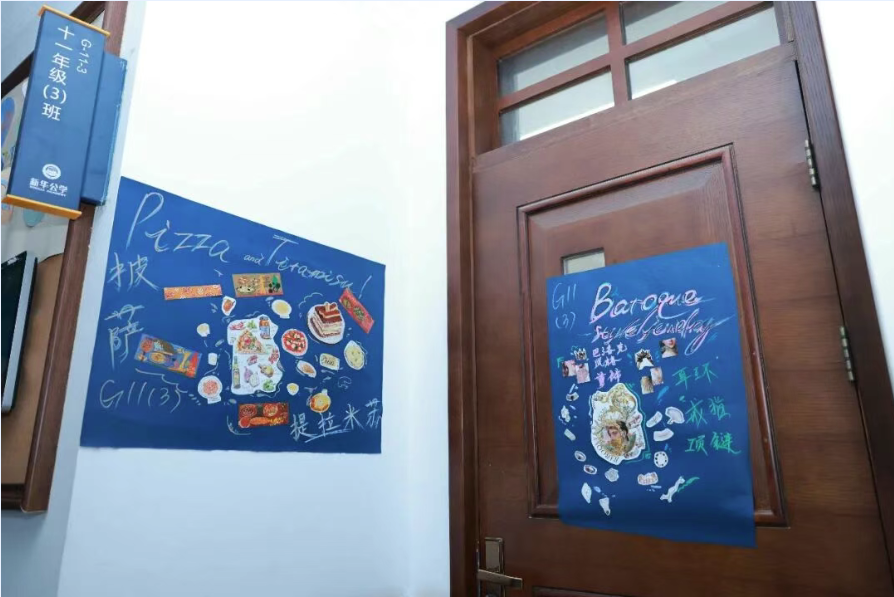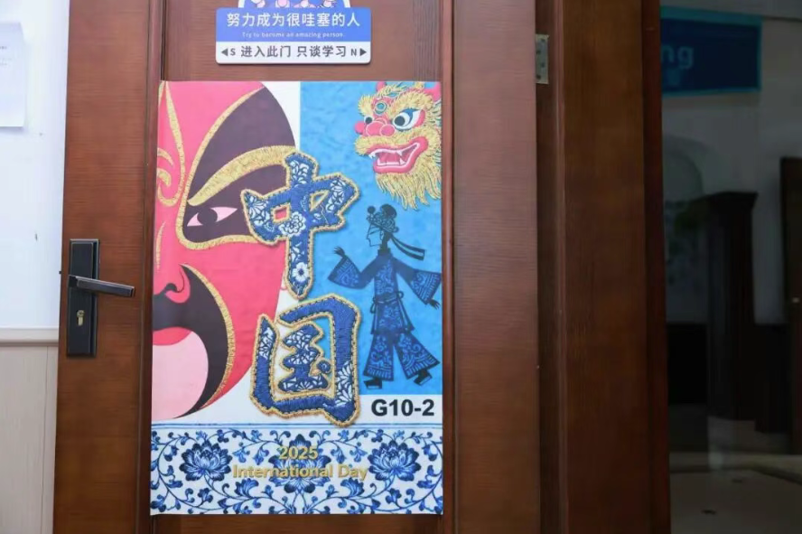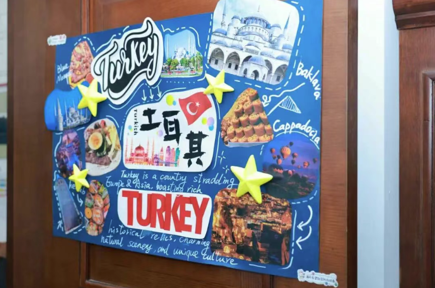 国际日的每一个环节,都由同学们自主设计、亲手完成。各班同学深入图书馆查阅权威资料,从国旗色彩的历史含义,到民族服饰的符号寓意,再到传统建筑的结构之美,细致梳理文化脉络,最终将研究成果转化为一张张精美的文化海报。这些海报不仅是视觉的展示,更是深度的文化叙述。张贴于各班门口,宛如一扇扇通向世界的窗口,吸引师生驻足交流。