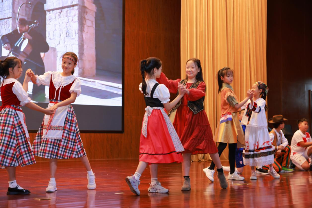 开幕式的高潮,是属于各个班级的“国家主题展示”。孩子们身着各国特色服饰,化身为小小的文化使者,用30秒至2分钟的时间,将世界文化的精髓浓缩于舞台之上。值得一提的是,所有中方教师身着典雅的中国传统服饰,旗袍与汉服交相辉映,在异域风情中凸显中华文化的独特魅力,象征着中国以开放的姿态拥抱世界。