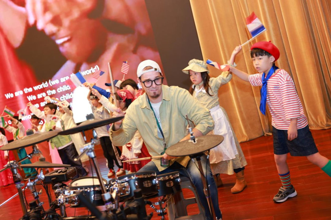 紧接着,激动人心的时刻到来。外教Dario以一段铿锵有力、节奏飞扬的架子鼓表演引爆全场,随之,那首响彻全球的经典旋律《We Are the World》悠然响起。就在歌声回荡的瞬间,一个巨大的、蔚蓝色的充气地球从舞台中央缓缓降下,如同希望的象征,缓缓落入人群。这一刻,全场沸腾了!孩子们兴奋地欢呼,家长们纷纷举起手臂,无数双手共同托举起这个属于我们每一个人的“地球”。地球在人潮中轻盈传递,映衬着一张张灿烂的笑脸。这个充满象征意义的瞬间,无需任何言语,便将“我们同属一个世界”的主题,深深烙印在每个人的心中。