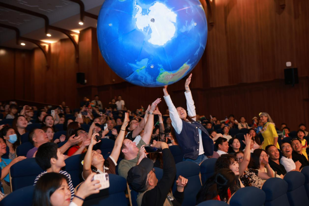 Then came an especially thrilling moment. Foreign teacher Dario electrified the auditorium with a powerful and rhythmic drum performance, seamlessly transitioning into the globally beloved melody of "We Are the World." As the song swelled, a giant, azure inflatable globe descended slowly from the center of the stage—a symbol of shared hope—gently lowering into the crowd. The room erupted! Children cheered with excitement, parents raised their arms, and countless hands joined together to lift this "Earth" that belongs to us all. The globe passed effortlessly above the sea of uplifted faces, each one beaming with joy. This deeply symbolic moment, without a single word spoken, etched the theme of "We are one world" deeply into every heart.