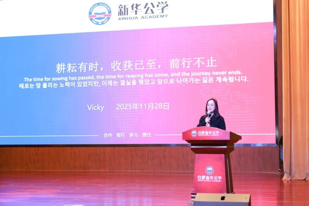 紧接着刘主任带着《耕耘有时,收获已至,前行不止》上台,PPT 一翻全是 “家长看得懂的成长数据”:从开学后学生及老师们活动亮点到日后的工作计划都交代的清清楚楚,安排的明明白白。当屏幕切到孩子们做实验、演课本剧的照片,有家长掏出手机对着照片放大:“那扎马尾的是我闺女!她在家都不爱跟我说话,居然敢上台又唱又跳啊!”小温馨:PPT还做成了三国语言,嘻嘻,真是我们的大贴心啊!