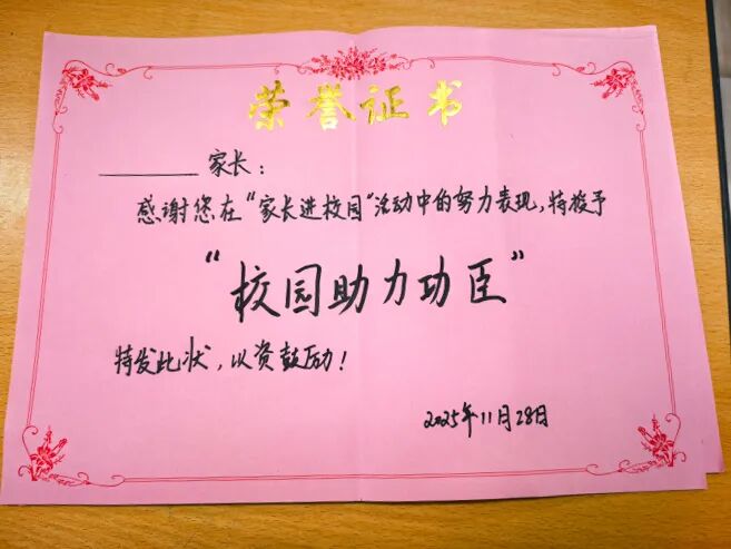 11:00 的班级家长会,直接变成 “双向奔赴茶话会”:老师掏出 “孩子的隐藏闪光点清单”,比如 “XX 主动帮同桌整理书包”“XX 会用成语劝架”;家长们则掏出 “家庭版迷惑行为大赏”,比如 “娃在家用课堂上学的‘思维导图’,给宠物猫列了‘一日作息表’”。单独交流环节,更是 “笑点与泪点齐飞”:一位妈妈握着老师的手说:“之前总觉得他‘不够专注’,今天才发现,他只是在‘用自己的节奏发光’。”这场开放日,就像给家长递了个 “放大镜”—— 原来那些藏在融合部课堂、课间里的小认真、小调皮、小成长,都是 “学习美好” 的正确打开方式。有的班主任们还给参加“家长进校园”的‘得力助手们’家长们颁发了荣誉证书。