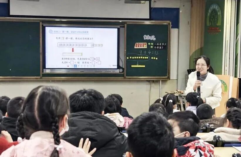 活动核心环节为高效课堂实践展示。第一节课是由张晓珂老师带来的一年级《9加几》,苏教版新教材将“9加几”作为20以内进位加法的起始课,其核心目标是让学生首次系统地理解并掌握“凑十法”,为后续学习建构模型。张老师的课堂紧扣思维训练,引导学生层层推演,在合作探究中感悟智慧,展现了扎实高效的常态教学功力。