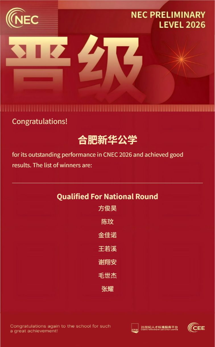 本届CNEC赛事规模空前,全球范围参赛学生逾50万人,竞争异常激烈。合肥新华公学学子能够全员晋级,不仅体现了他们扎实的学术功底与出色的综合能力,更展现了学校在国际化教育道路上的深厚积淀与育人成果。